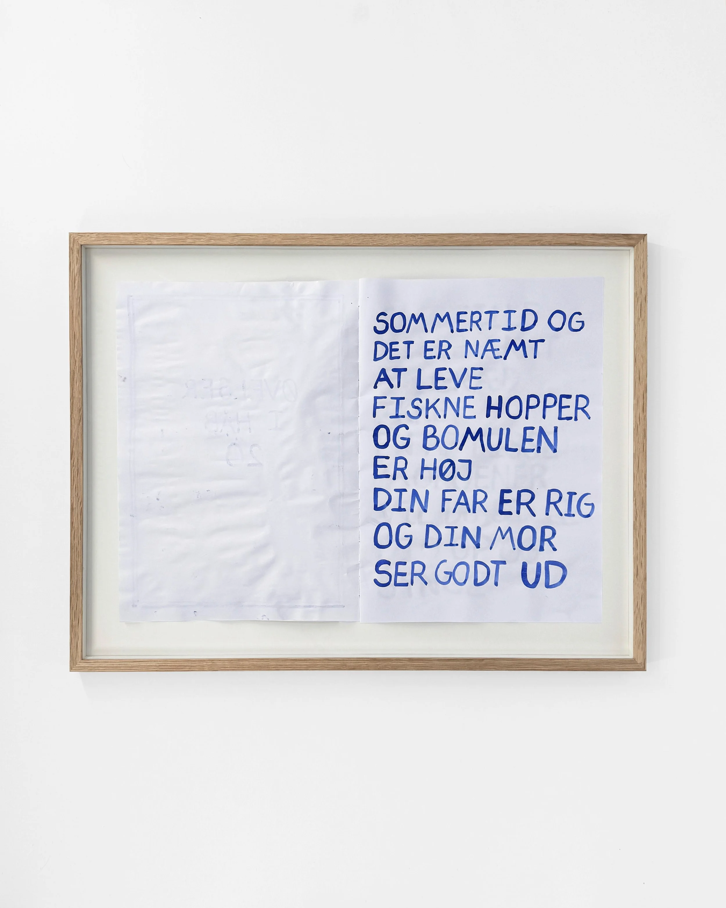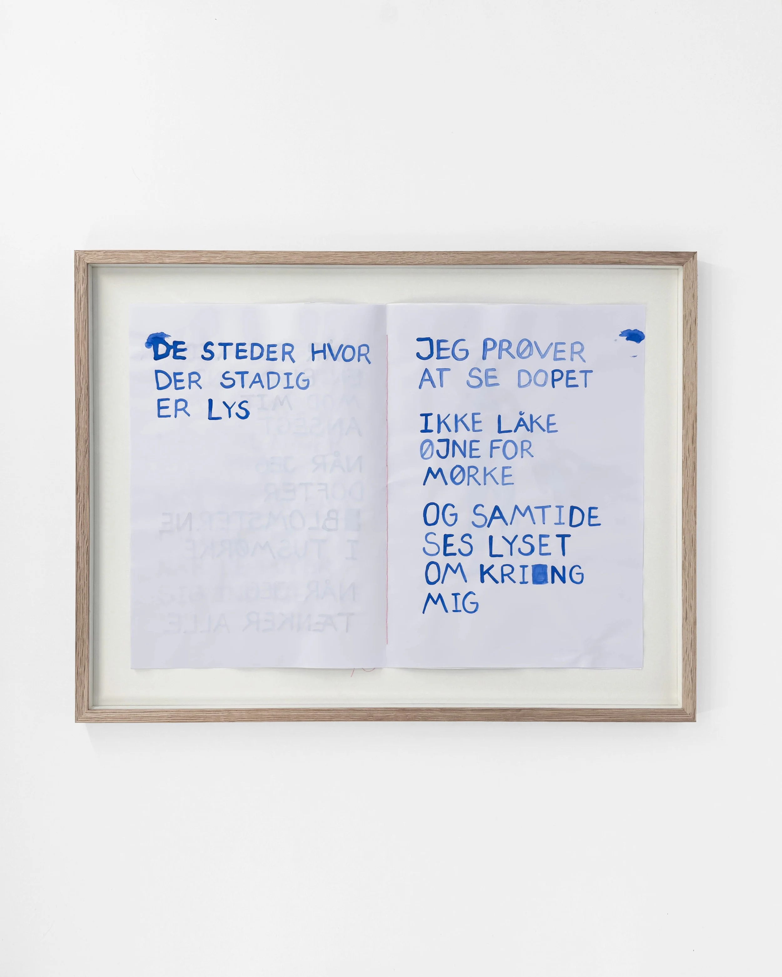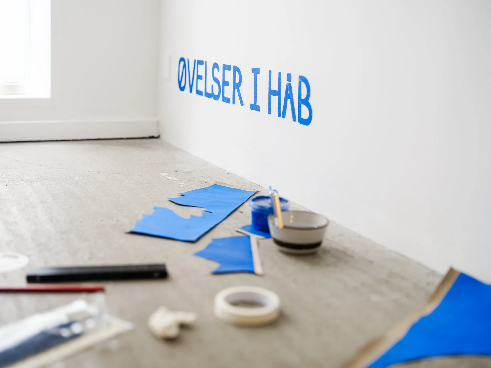 Udstillingens værker er øvelser, ikke færdige værker, men ufuldstændige og skrøbelige kunstværker. Papiret er tyndt, vandfarverne flyder ud, og der er fyldt med fejl. I den forstand er værkerne ikke anderledes end os, der ser udstillingen. Vi øver os alle sammen – som børn og forældre, som venner, kunstnere eller kolleger – og vi bliver aldrig færdige. At turde vise sin ufuldkommenhed kræver et enormt mod, ligesom det kræver mod at håbe, når det er nemmere at være apatisk eller kynisk.
