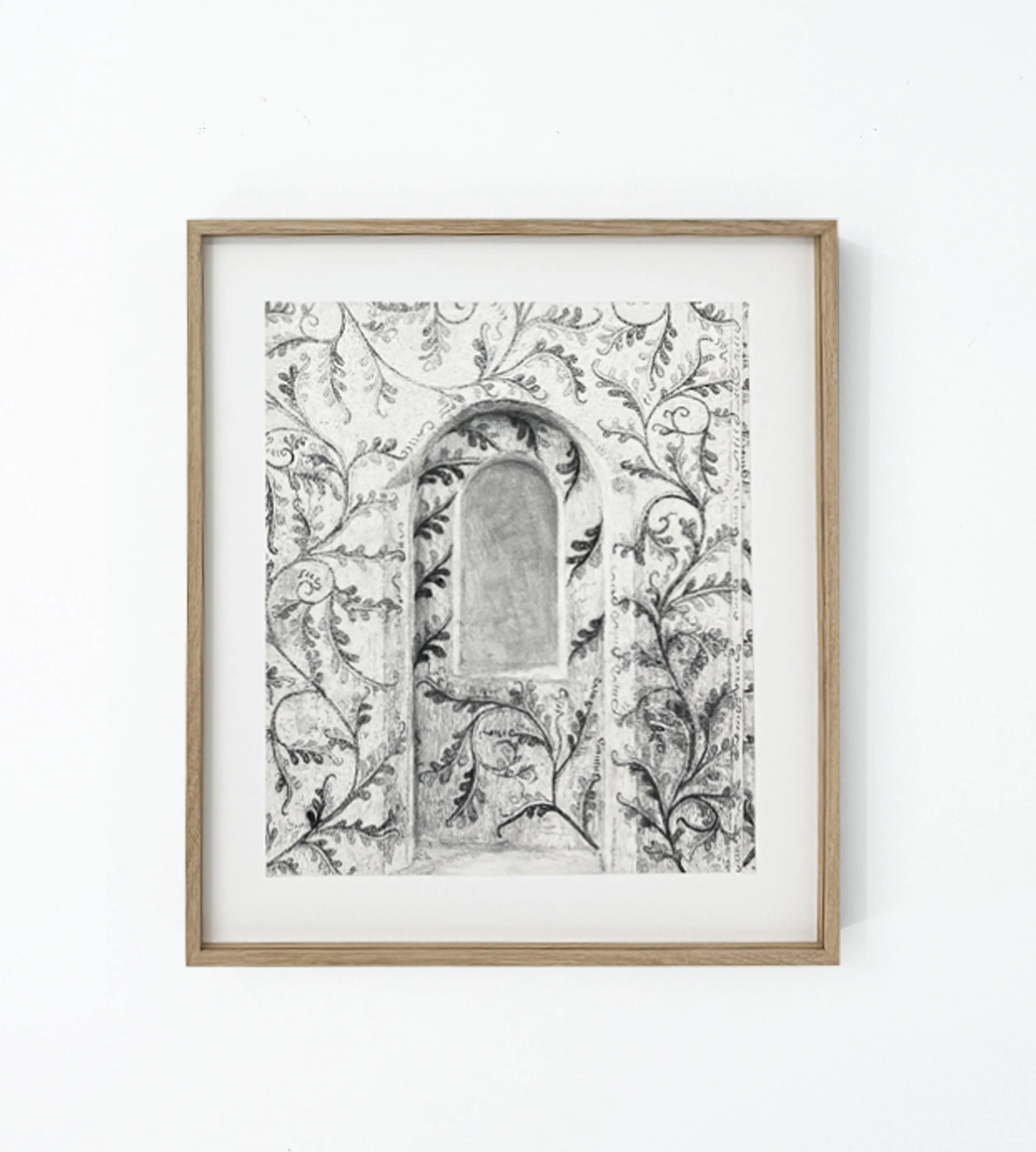 Kul og blyant på papir 43 × 37 cm. Indrammet i egetræsramme med museumsglas (UV92) ca 53 × 47 cm.