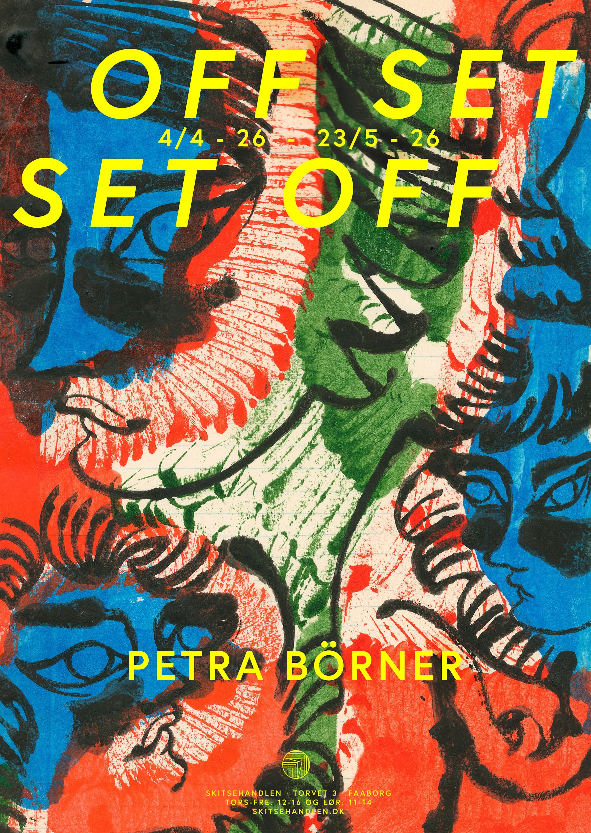 Off Set – Set Off, the title of her upcoming solo exhibition at Skitsehandlen, nods to her way of working. Working with changing tempo, confident lines spill across colour in looping gestures, while paint is pressed or printed onto paper to reveal spontaneous results. Elements slightly askew and out of sync sit together in curious constellations, as if not quite supposed to be there.