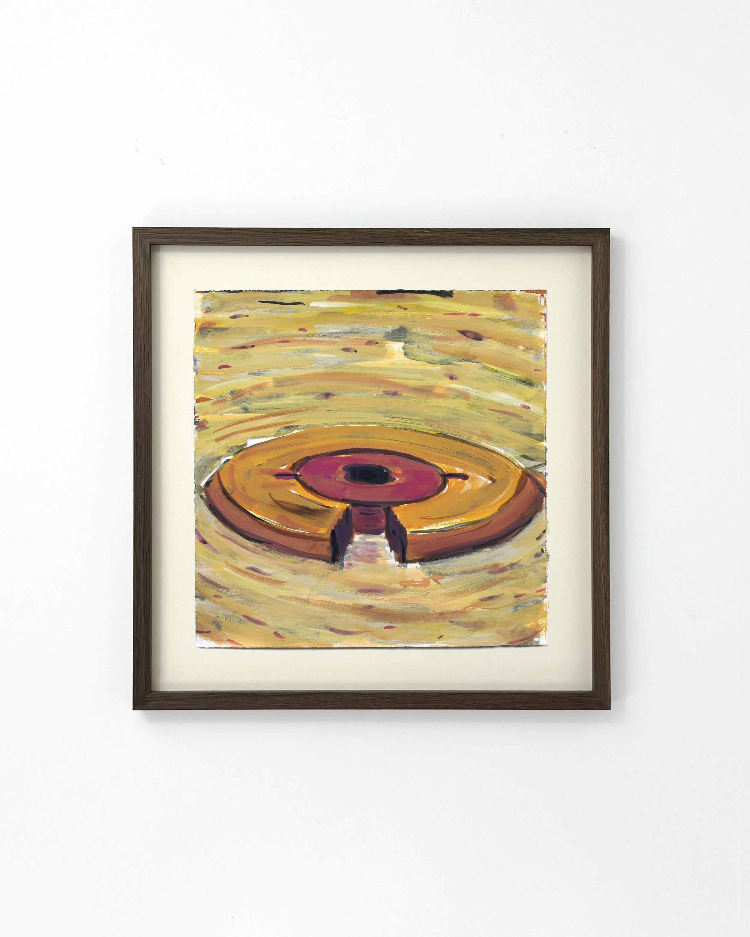 Akryl på papir ca. 30 × 30 cm. Indrammet i røget egetræsramme med museumsglas ca. 37 × 37 cm.
